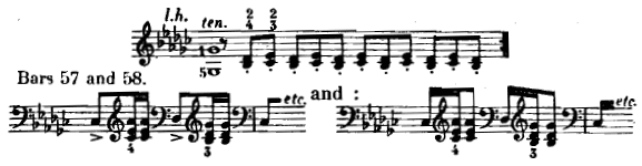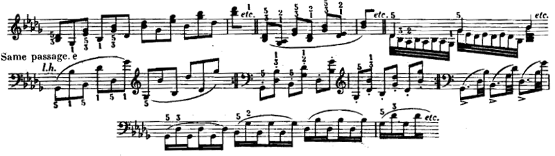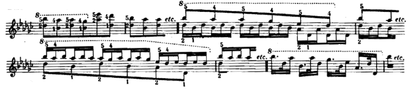 Poza ćwiczeniami Cortota polecam jeszcze jedno - dla prawej ręki. W miejscach, gdzie następuje trudność techniczna (zmiana pozycji), należy zrobić "cięcie", przesunąć rękę i kontynuować w ten sposób dalsze ćwiczenie.