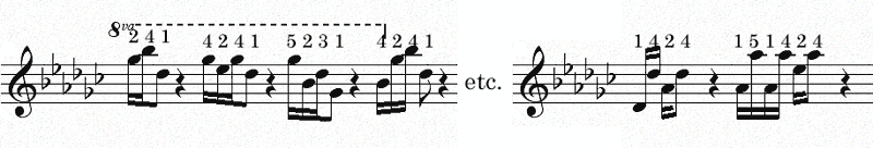 Ćwiczenia przygotowawcze do tej etiudy powinny być uzupełnione jeszcze ćwiczeniem skal w oktawach na czarnych klawiszach na zmianę - staccato, przy użyciu tylko kciuka i 5. palca - oraz legato według podanego niżej palcowania: