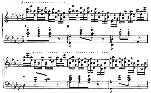 W tej Etiudzie powinno się ćwiczyć lewą ręką oddzielnie i położyć duży nacisk na grę wyraźną i precyzyjną.
