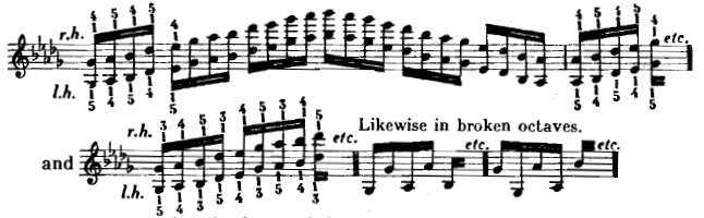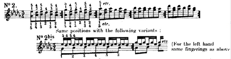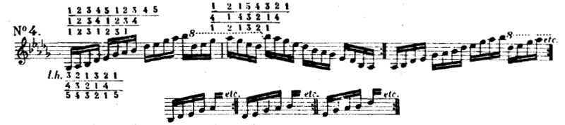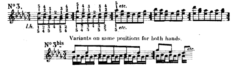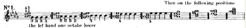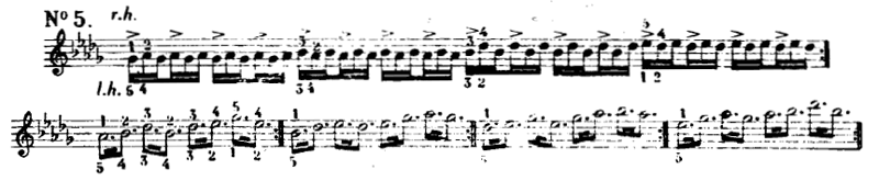 Należy z wielką ostrożnością unikać przesadnego podnoszenia palców; muszą one trzymać się blisko klawiszy, podobnie jak w ćwiczeniu z trzymanymi nutami (nr 1). Elastyczny przegub umożliwi ręce swobodne przesuwanie się. Prawa ręka powinna być ćwiczona oddzielnie.