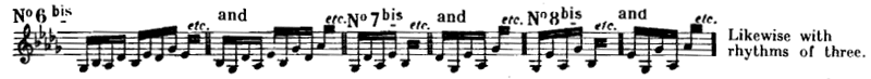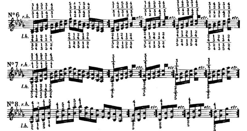 Ćwiczenia 6 - 7 - 8 powinny być grane legato, następnie w łamanych dwudźwiękach, na zmianę od górnej i dolnej nuty legato i staccato palcowe. Należy unikać jakiejkolwiek nierówności wynikającej z podkładania kciuka. Palcowanie jak wyżej.